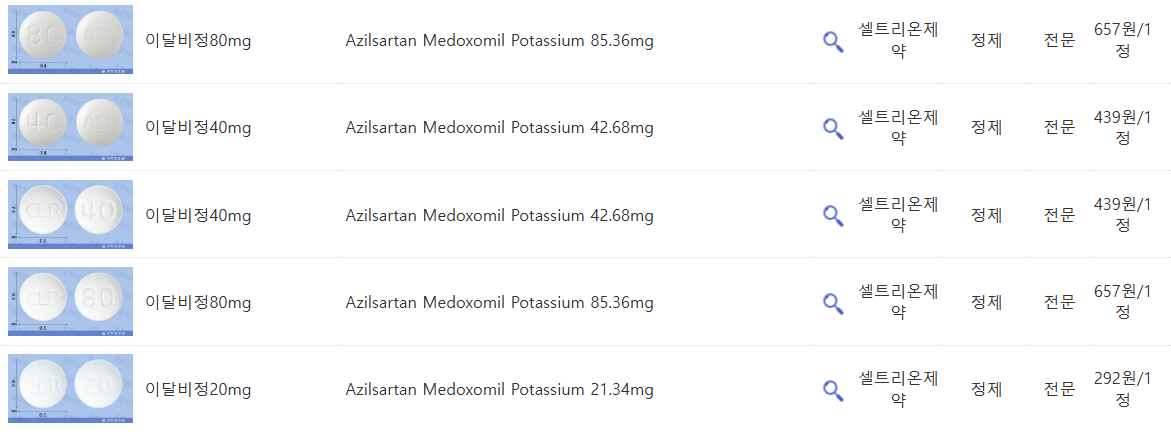 - 이달비정 40mg: 아질사르탄메독소밀 40mg
