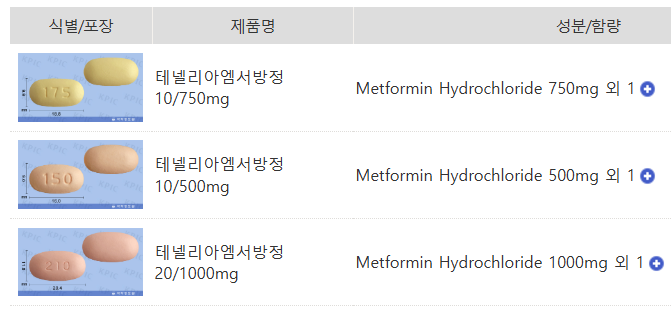 - 테넬리아엠서방정 10/500mg: 테네리글립틴 10mg, 메트포르민 500mg