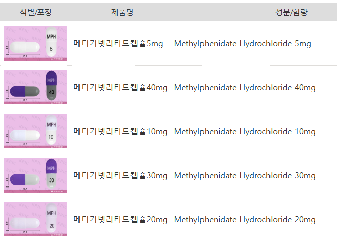 - 성분: 메틸페니데이트염산염